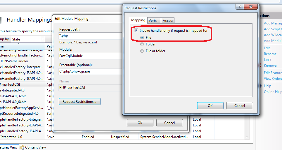 点击ISAPI和CGI限制,点击添加,路径为C:\php\php-cgi.exe,描述可写php,允许执行扩展路径,确定。